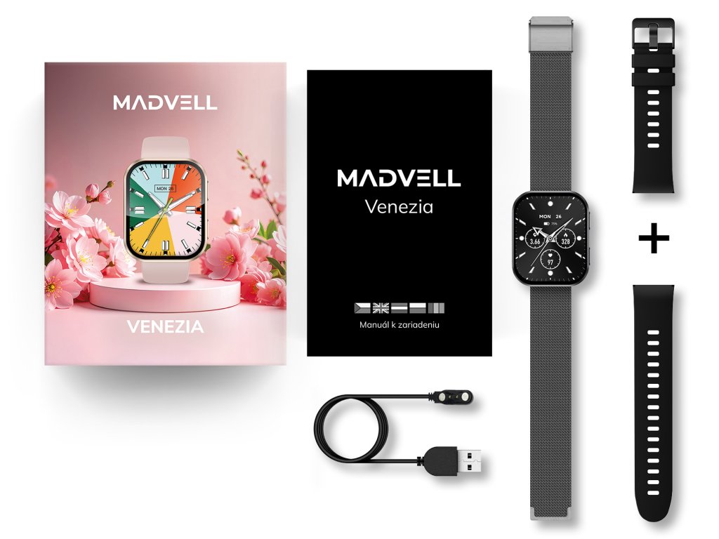 Madvell Venezia❤️ – dámske inteligentné hodinky inšpirované talianskou eleganciou a módou, spájajú špičkovú technológiu s vycibreným dizajnom. Krásny AMOLED displej s uhlopriečkou 1,96" je jemne zaoblený a podčiarkuje výnimočný charakter hodiniek. Na výber je viac než 500 unikátnych ciferníkov ✨, vďaka ktorým si hodinky jednoducho zladíte so svojím štýlom aj náladou. Sledujú krvný tlak, srdcový tep, hladinu kyslíka v krvi (SpO₂), stres aj kvalitu spánku. Hodinky pripojíte ku každému smartfónu s Android aj iOS a zobrazujú notifikácie zo všetkých aplikácií. Za kvalitou si stojíme – preto majú hodinky 3-ročnú záruku ✅